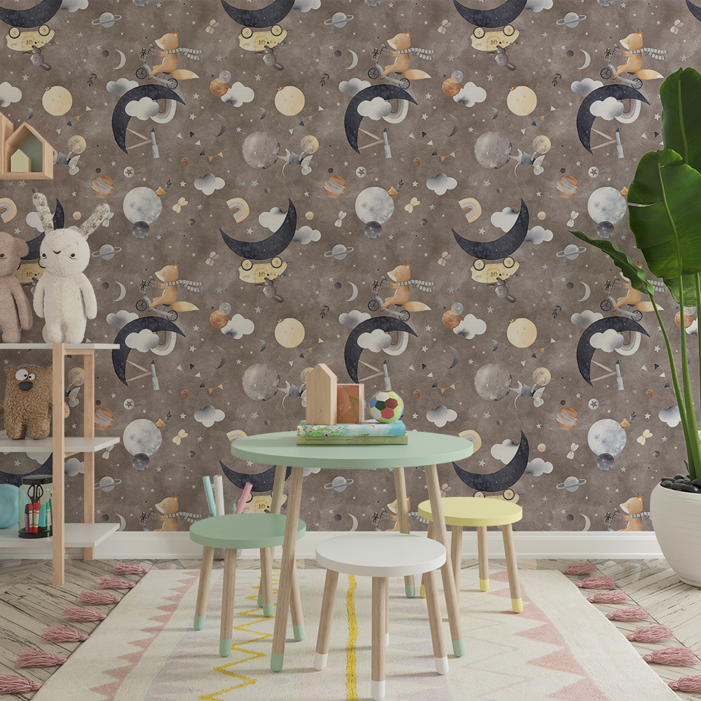 Papel de Parede Animais Fofos Raposa na Bicicleta e Coelho no Carro na Noite Estrelada