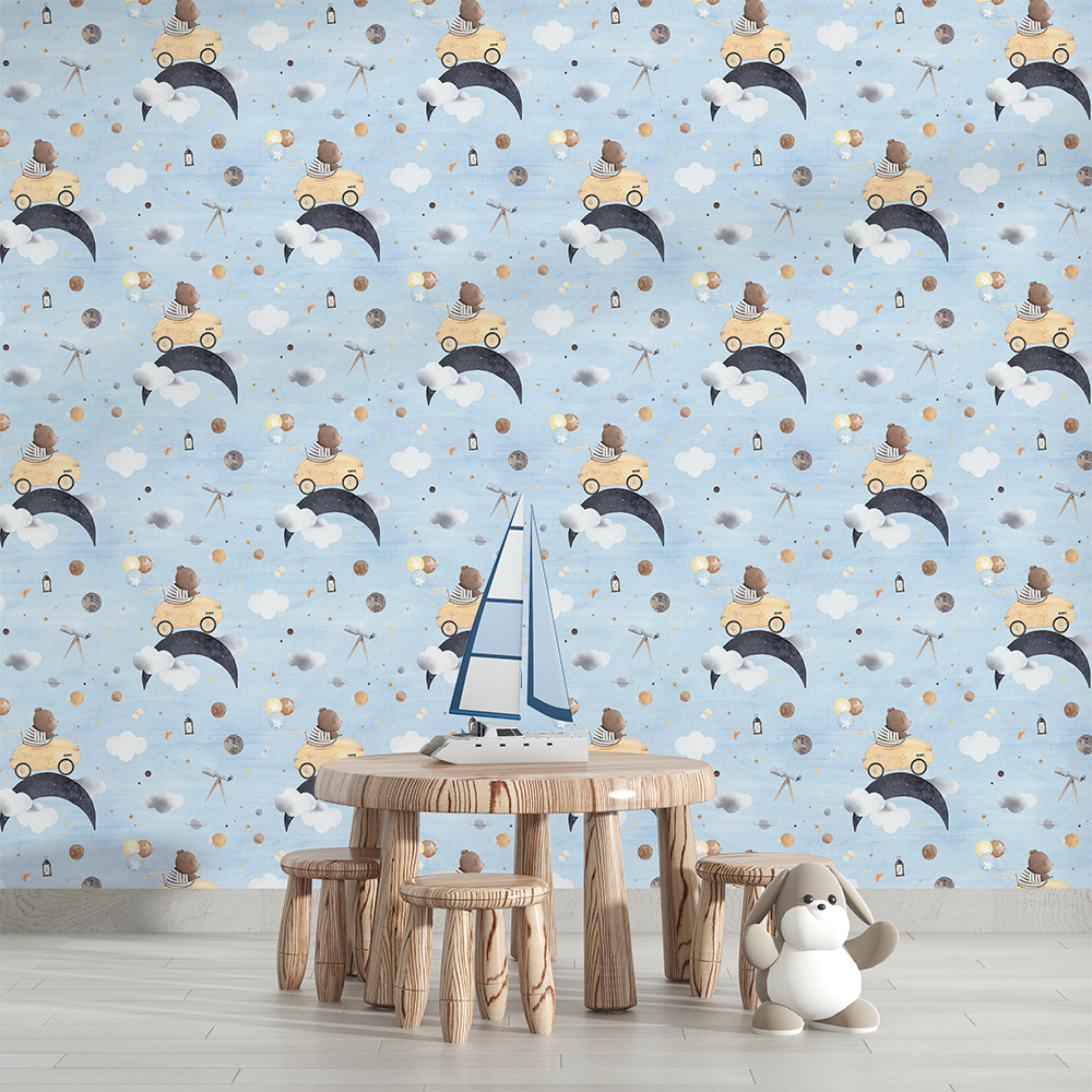 Papel de Parede Animais Fofos Urso de Carro no Céu Estrelado Azul