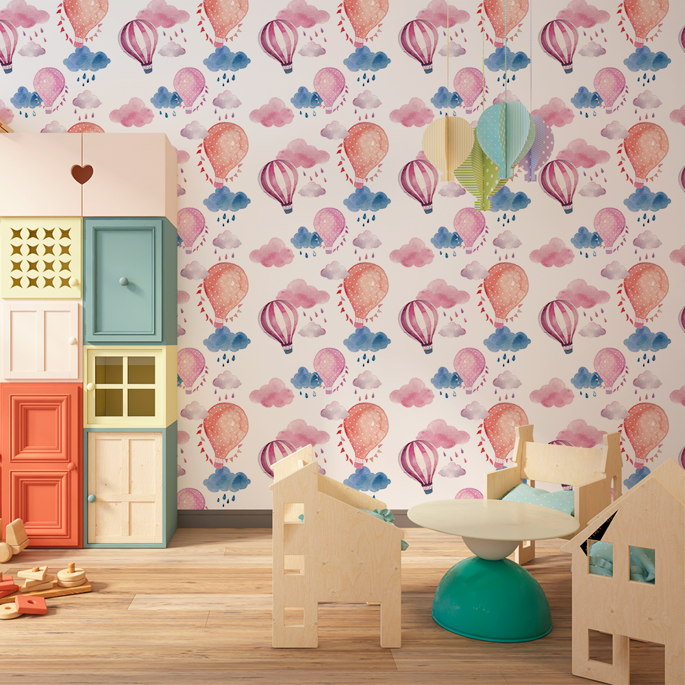 Papel de Parede Infantil Nuvens e Balões Vigem Chuvosa Aquarelado