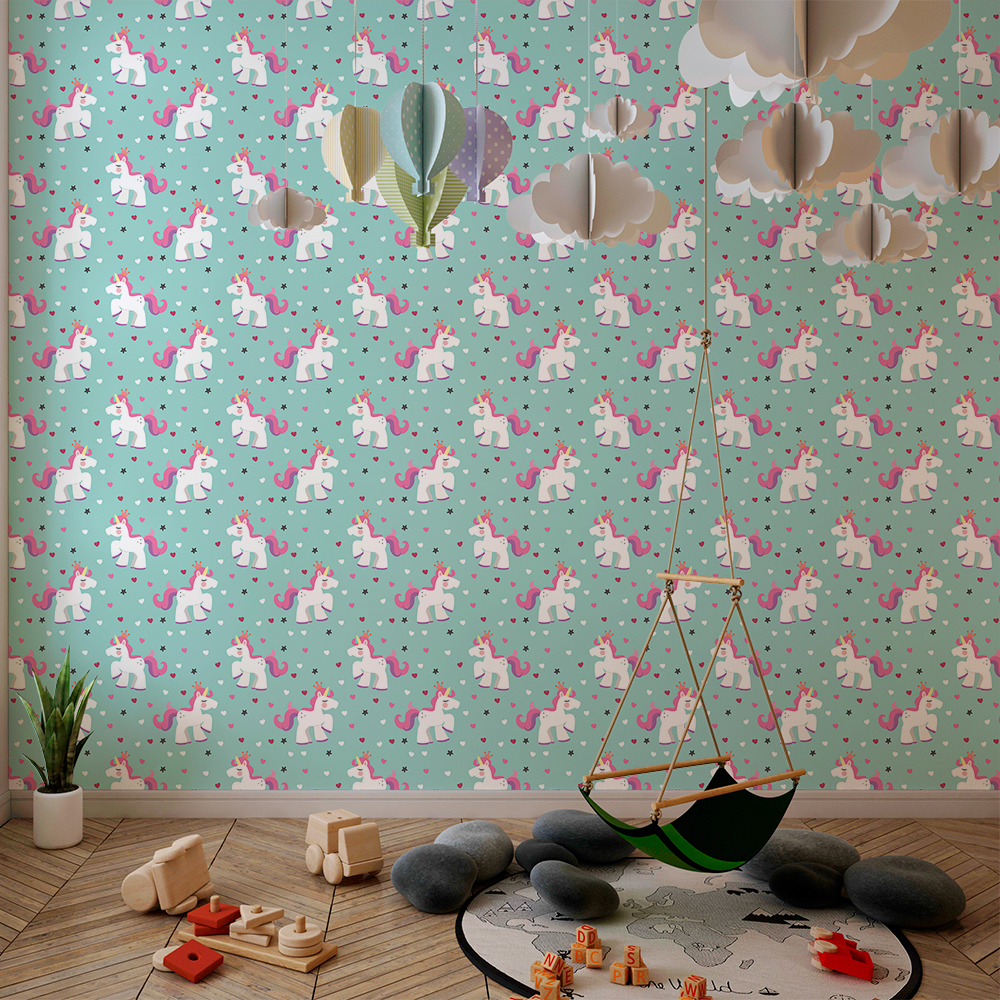 Papel de Parede Unicórnios, Corações e Estrelas no Fundo Verde