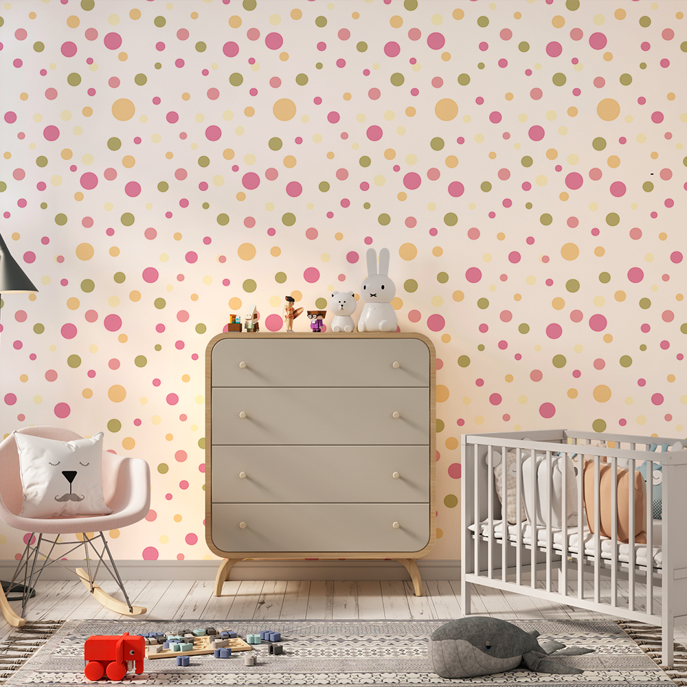Papel de Parede Poá Bolinhas Rosa, Amarelo e Verde