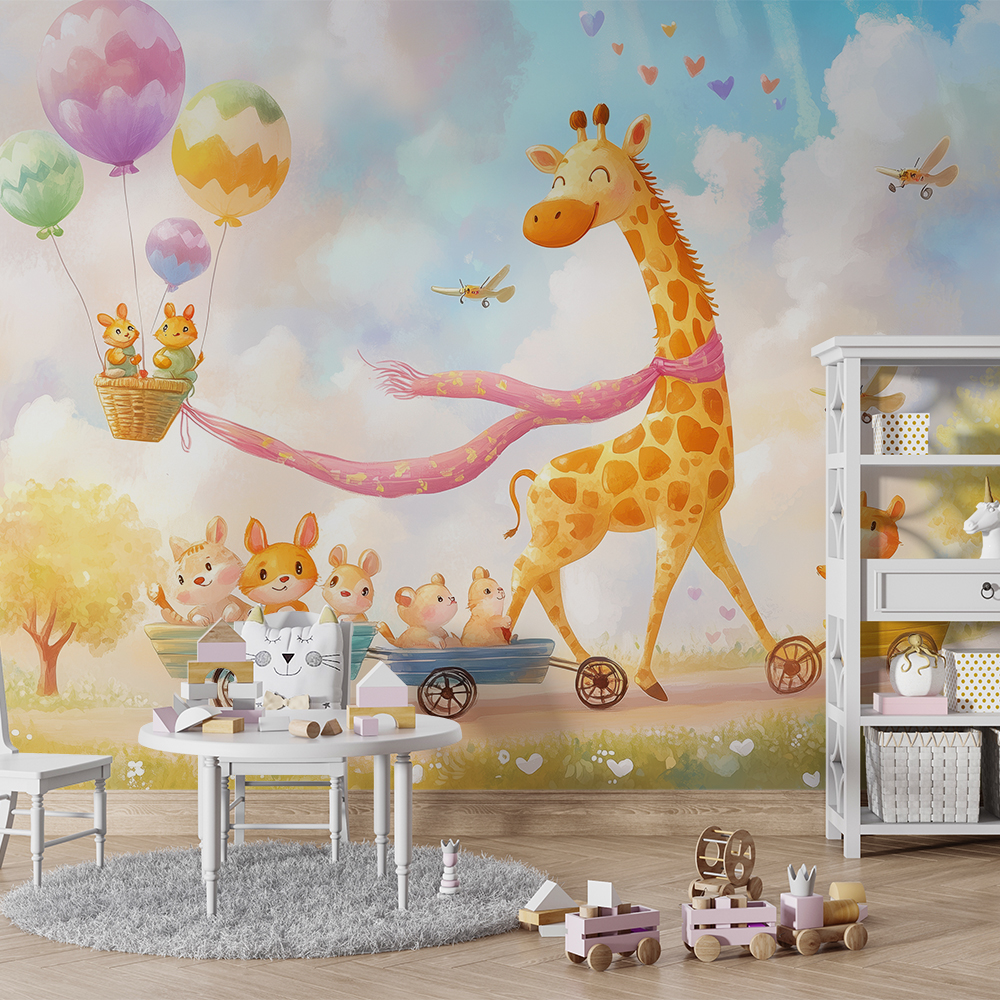 Papel de Parede Safari Girafa e Seus Amigos no Trenzinho