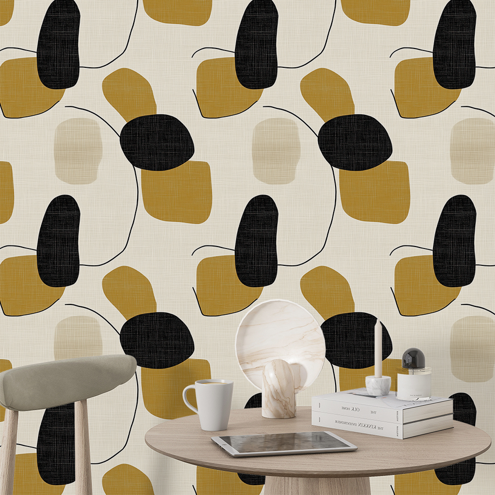 Papel de Parede Abstrato Linhas e Formas Preto e Ocre Elegante