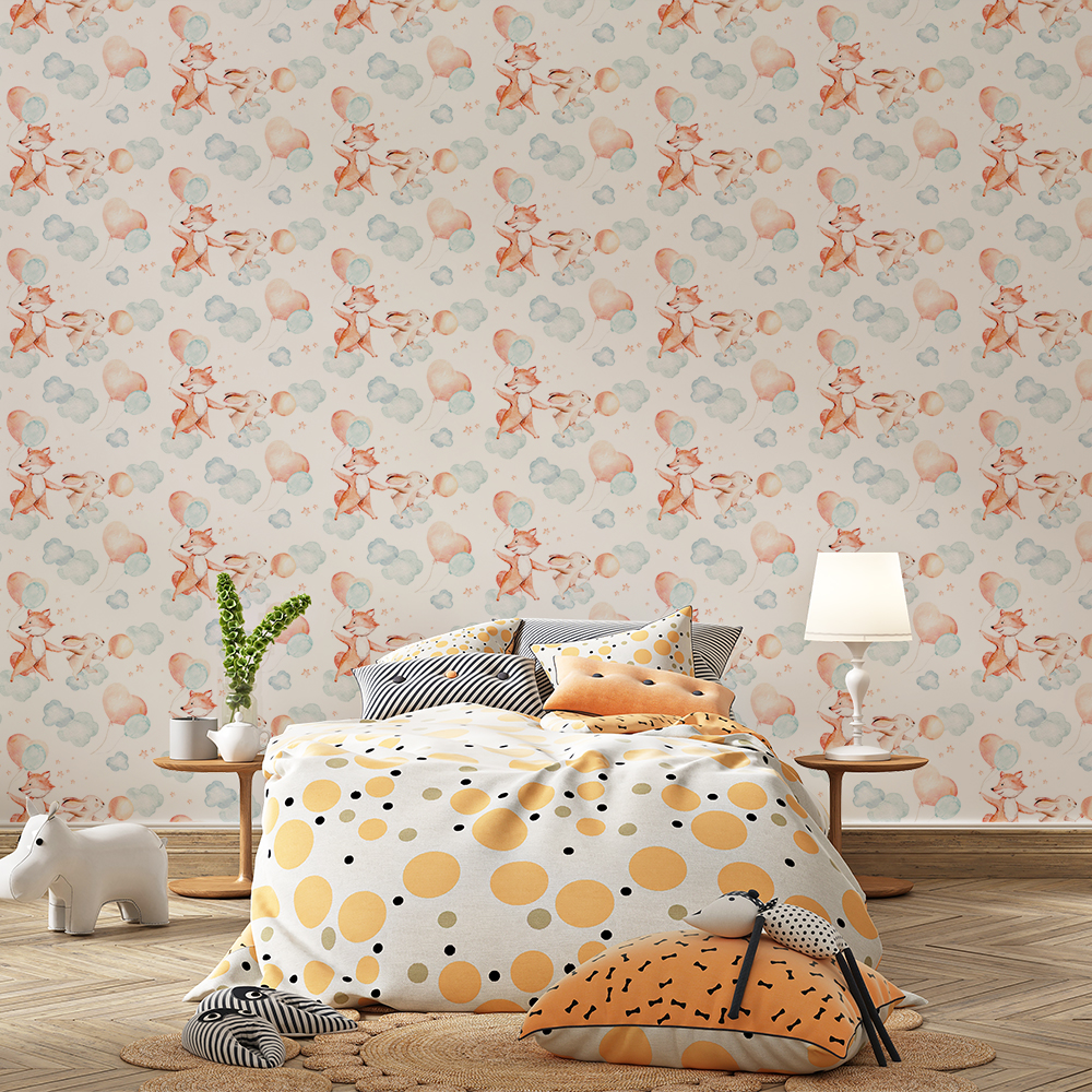 Papel de Parede Animais Fofos Raposa e Coelho nas Nuvens