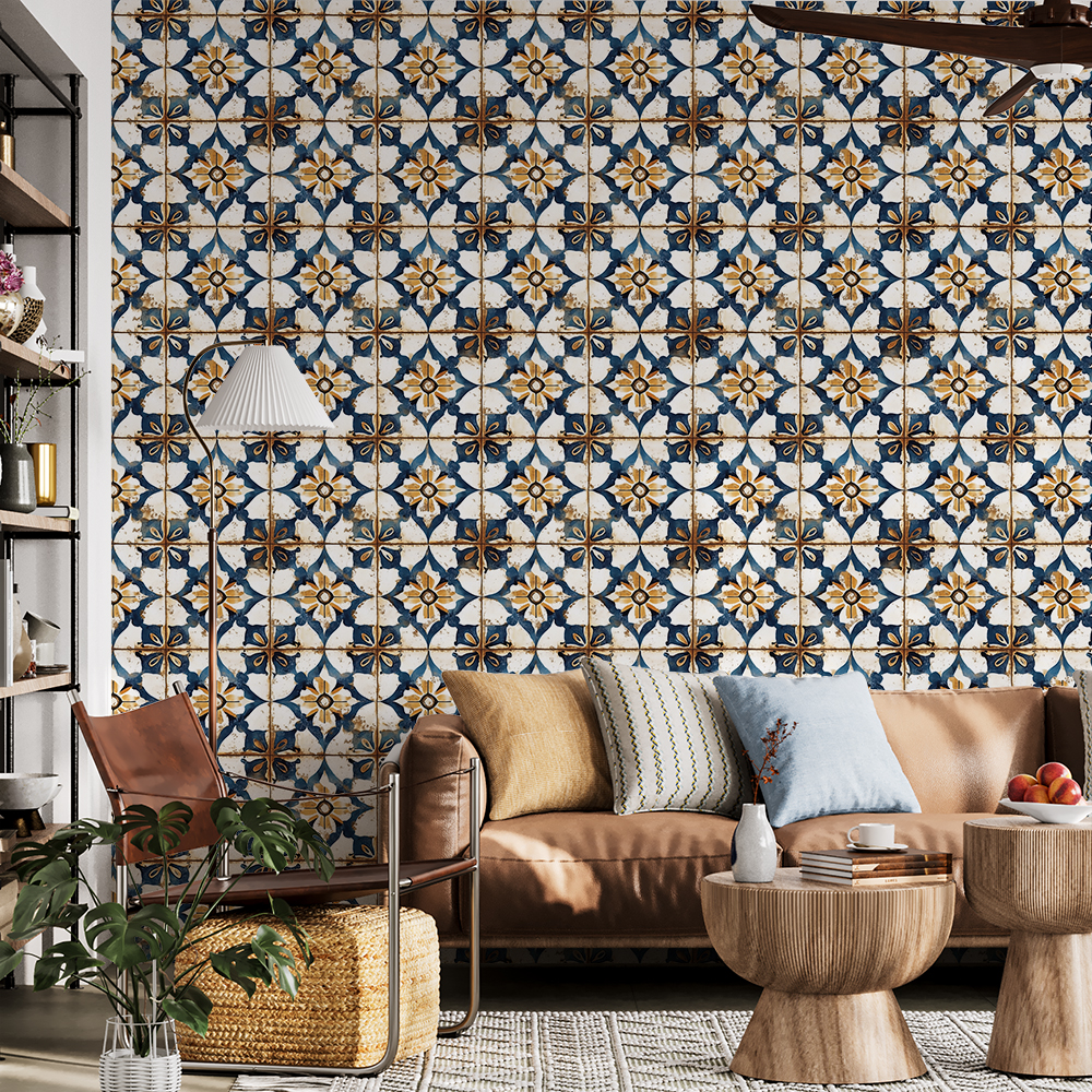 Papel de Parede Azulejo Colonial Floral Azul e Ocre