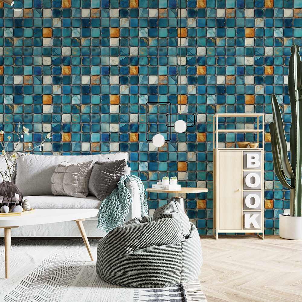 Papel de Parede Azulejo Pastilha Azul Turquesa e Ouro Velho