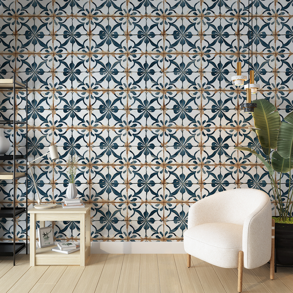 Papel de Parede Azulejo Português Floral Azul e Branco