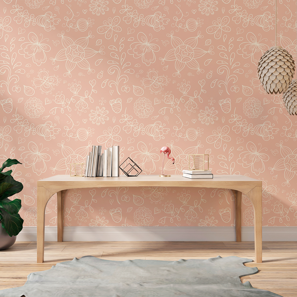 Papel de Parede Floral Desenhado Flores Brancas em Fundo Rosa Pastel