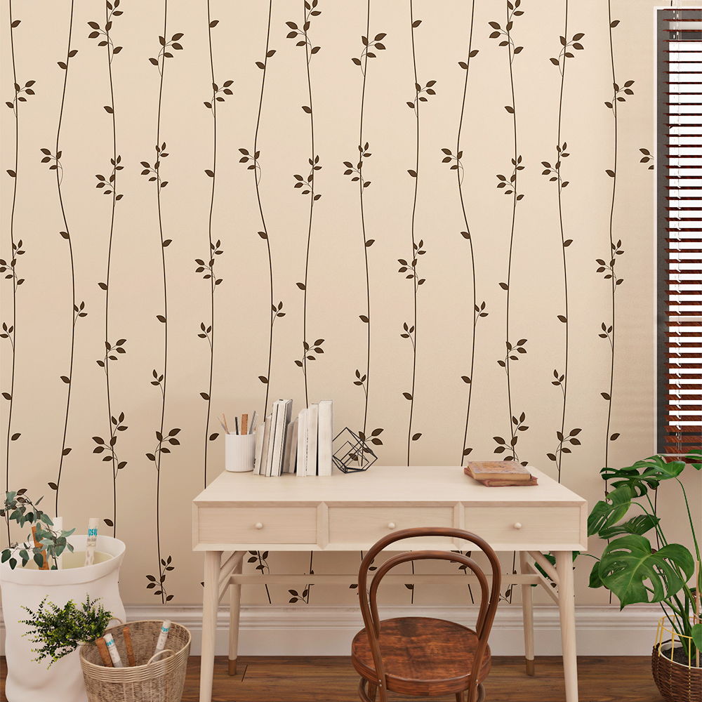 Papel de Parede Floral Ramas de Folhas Escuras em Fundo Bege