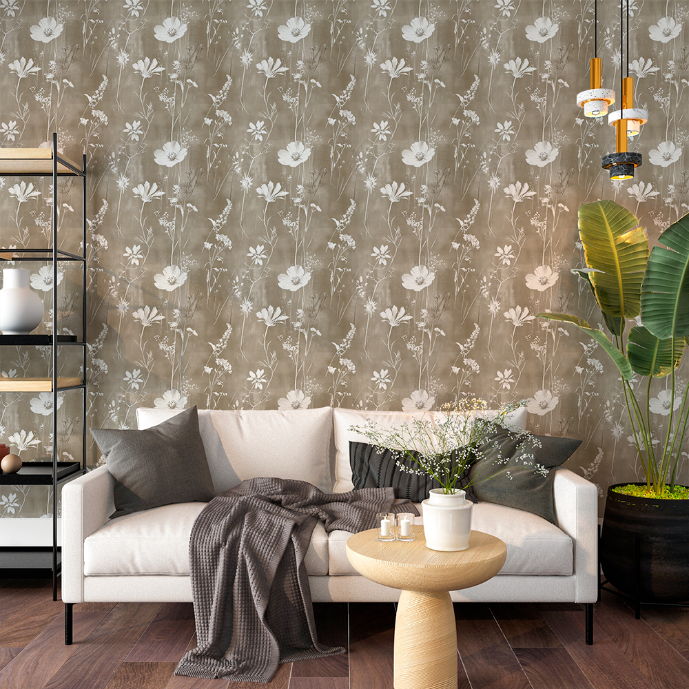 Papel de Parede Floral Folhas Brancas no Fundo Bege
