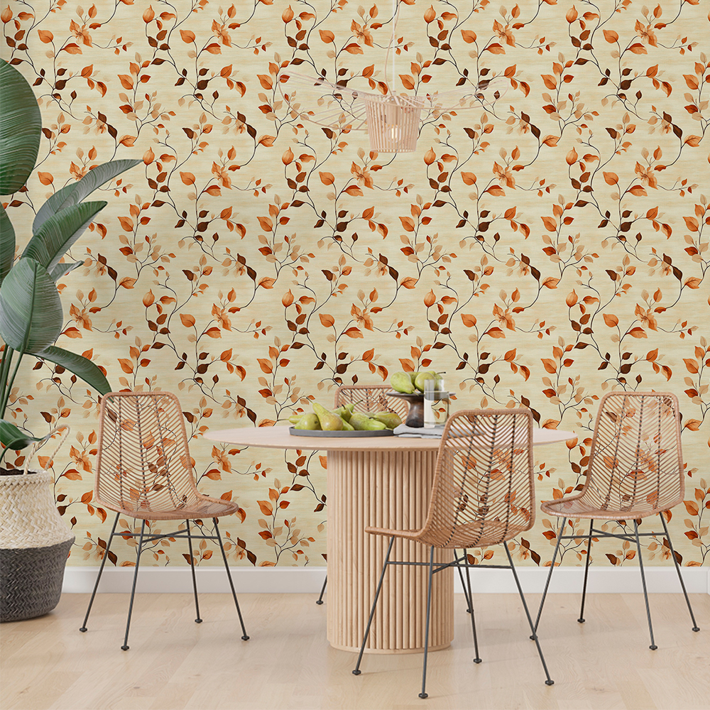 Papel de Parede Floral Folhas Laranjas e Fundo Amarelo
