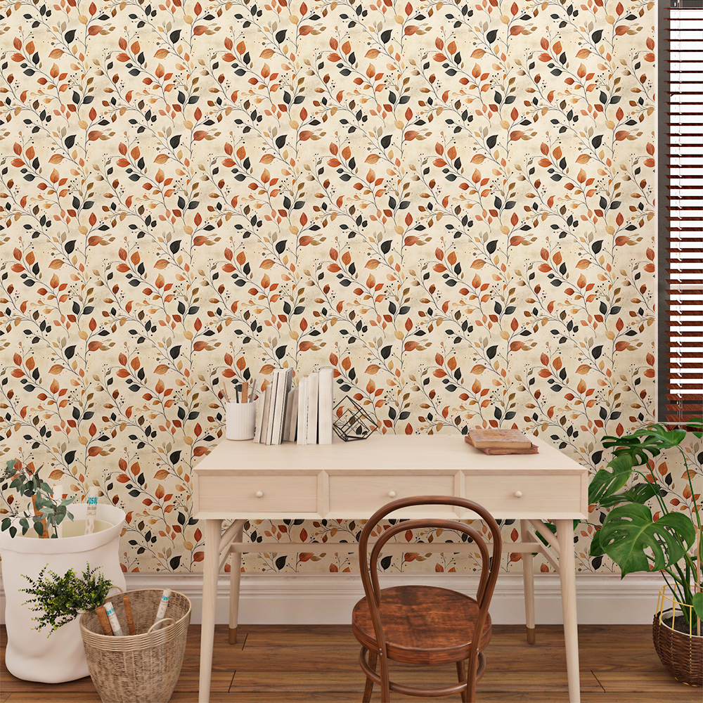 Papel de Parede Floral Folhas Vermelhas e Azul Escuro