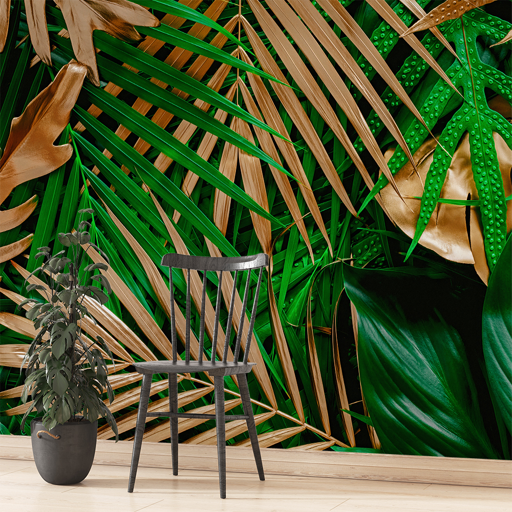 Papel de Parede Folhas de Palmeira Verde e Dourado Metálico