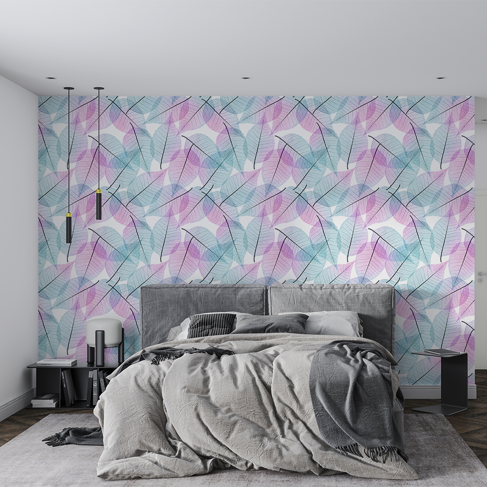 Papel de Parede Folhas Rosa e Azul Delicadas Efeito Vidro