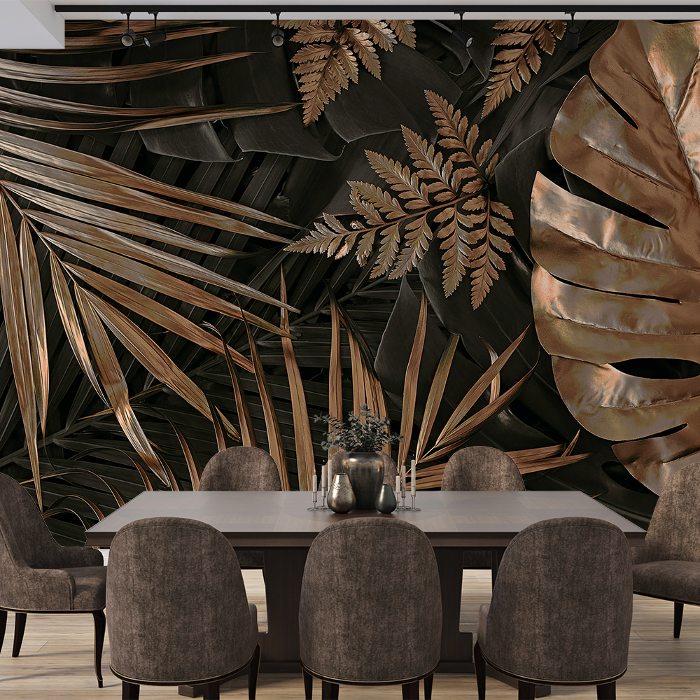 Papel de Parede Folhas Tropical Ouro Velho Escuro