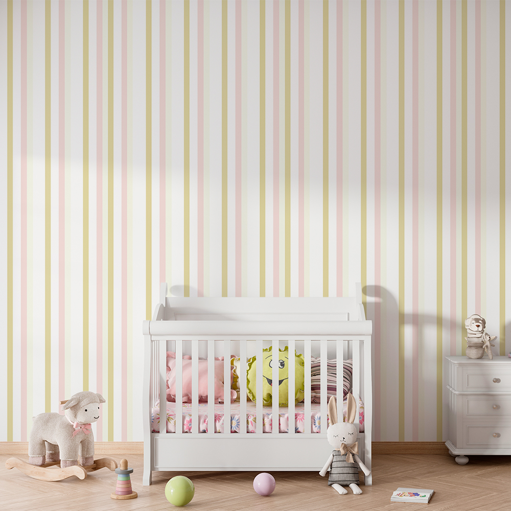 Papel de Parede Listrado Branco, Rosa e Bege em Tons Suaves
